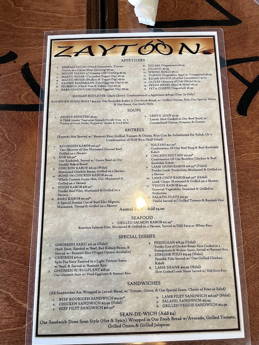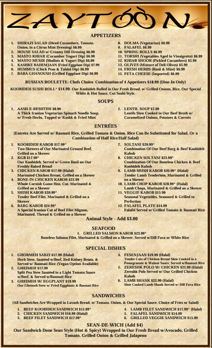 The menu at Zaytoon - NV 89147 offers a variety of Persian and Middle Eastern dishes, reflecting its specialization as a Persian, Halal, Kosher, Mediterranean, and Middle Eastern restaurant and grocery store. The menu features appetizers, special dishes, and desserts, providing options for different dining occasions, from light meals to more substantial dishes.